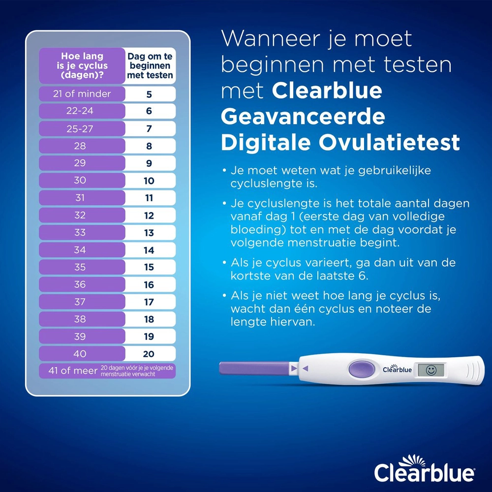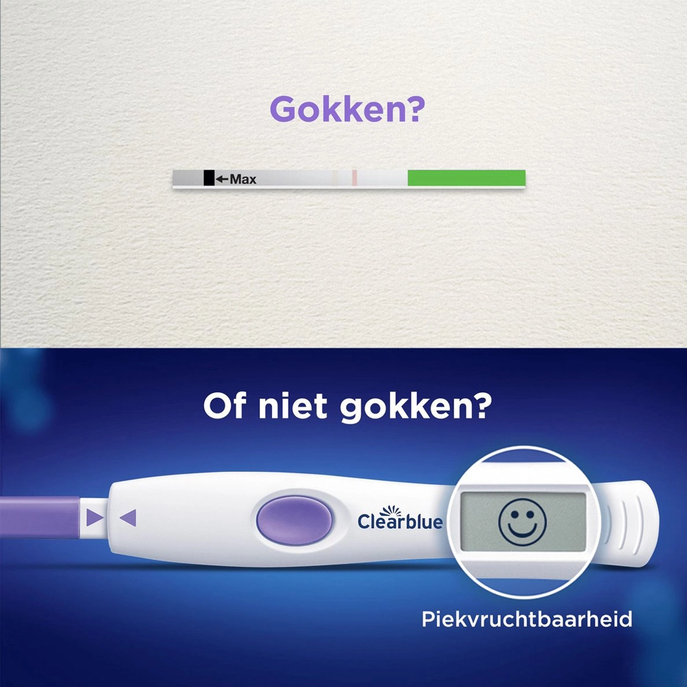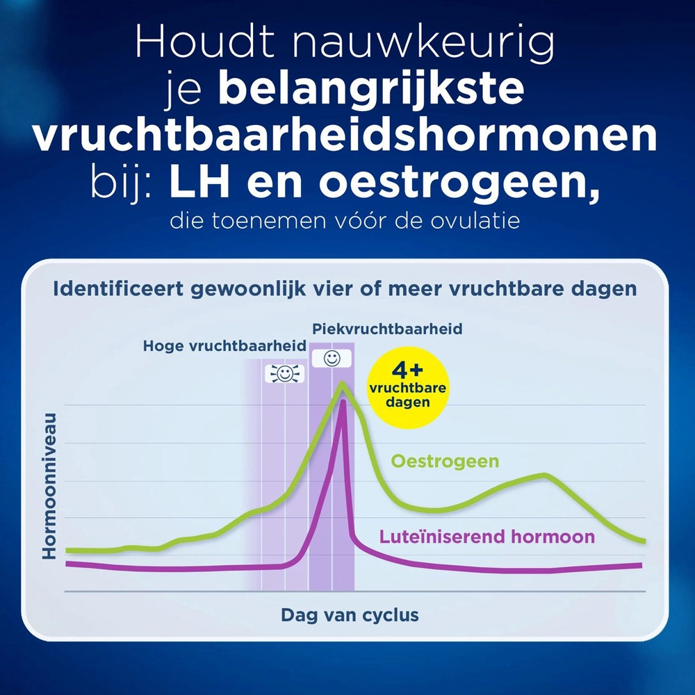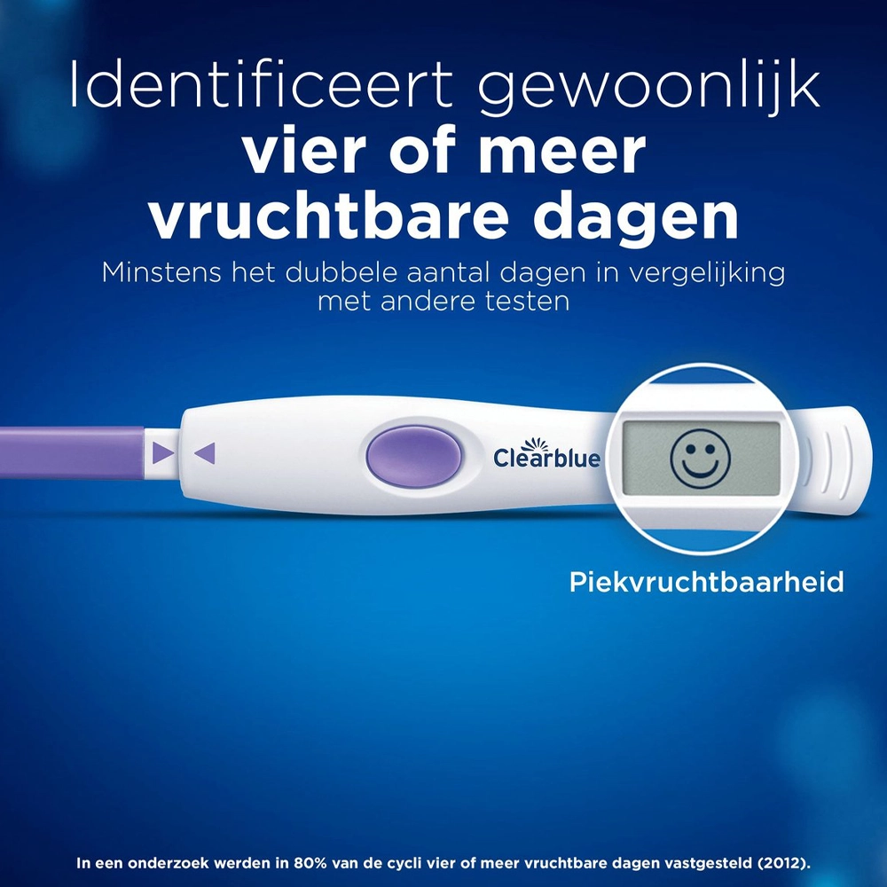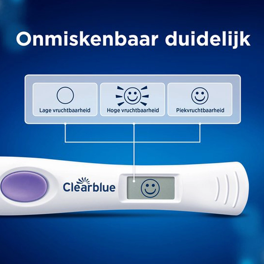 Door deze dubbele hormoonmeting identificeert Clearblue doorgaans vier of meer vruchtbare dagen per cyclus. Zodra jouw lichaam het juiste moment aangeeft, verschijnt er een smiley op het scherm. Dit betekent dat dit de dagen zijn waarop je de grootste kans hebt om zwanger te worden.